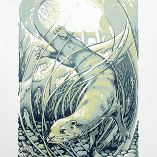At long last and after a lot of design and preparation work, this otter print is finished. A varied edition again, printed using Caligo Safewash inks onto Somerset satin paper. There are three main colourways, one ochre, one blue and one a range of greens and blues.