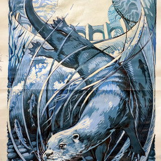 The bridge looking up through the water is based on the bridge at Crickhowell near to where I live. Otters have been seen around here again over the past few years. I’ve tried to show the water falling over the weir and the weed and gyres twisting with the wriggling and darting movements of the otter.