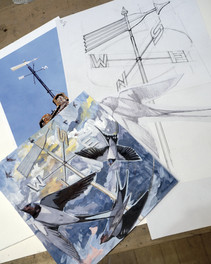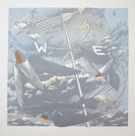 I've tried to get that dizzying swirling feeling of the birds flying by putting the weathervane at an angle.